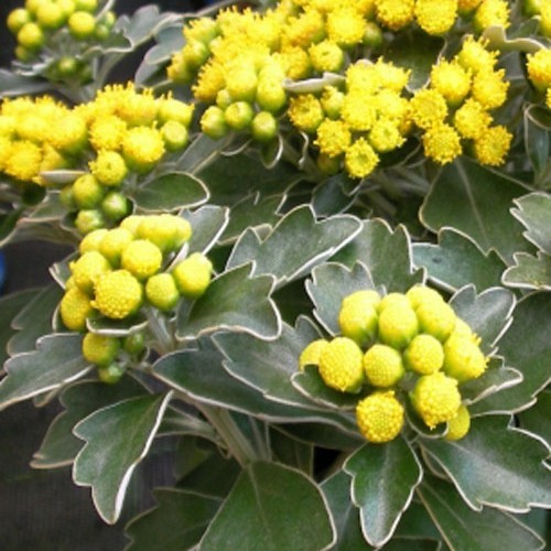 Аджанія – цвіте маленькими жовтими шапочками, акуратно зібраними в кошикові суцвіття, які схожі на суцвіття сріблястої цинерарії. Висота компактного кущика 40см. Стебла густо облистяні, листя зелене, зубчасте, зі світло-білою сріблястою облямівкою по краю.