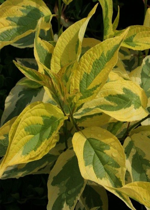 Дерен білий “Gouchaultii” (Гоучаулті), ще називають Кизил, відноситься до сімейства кизилових. Листопадний, декоративний чагарник висотою до 3 метрів з довгими, прямими гілками, що схиляються до землі. Пагони темно-червоного кольору, листя світло-зелені із золотистою, окантовкою, еліптичні з подовженим гострим кінцем, довжина яких становить 8-10 см. Діаметр крони становить близько 4 метрів. Швидкорослий чагарник із строкатим листям, з приростом близько 20 см. на рік. У травні кущ зацвітає багатьма білими квітами, зібраними у великі суцвіття. Легко переносить стрижку, люблять сонячні ділянки та півтінь. До ґрунту не вимогливий, віддає перевагу вологим місцям. Розмножується живцями, насінням, поділом коріння
