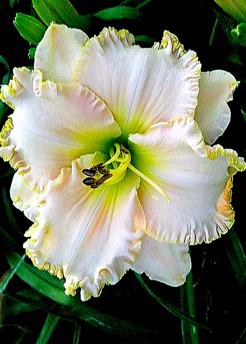 Лілійник Victorian Lace – Велико-квіткова багаторічна, трав’яниста квітка, висота квітконоса становить 75 см. а діаметр квітки 17 см, перлово-рожевий колір із зеленим горлом, з рожево-жовтою широкою гофрованою облямівкою, лепестки широкі плотні. Листя прикореневе, довжелезне. Зацвітає сорт у липні стійкий до хвороб. Загальна тривалість цвітіння 25 днів, квітка цвіте у розкритому стані – 1 день, поряд зацвітає інший, ніби змінюючи один одного. Є сорти повторно квітучі, у яких тривалість цвітіння збільшується.