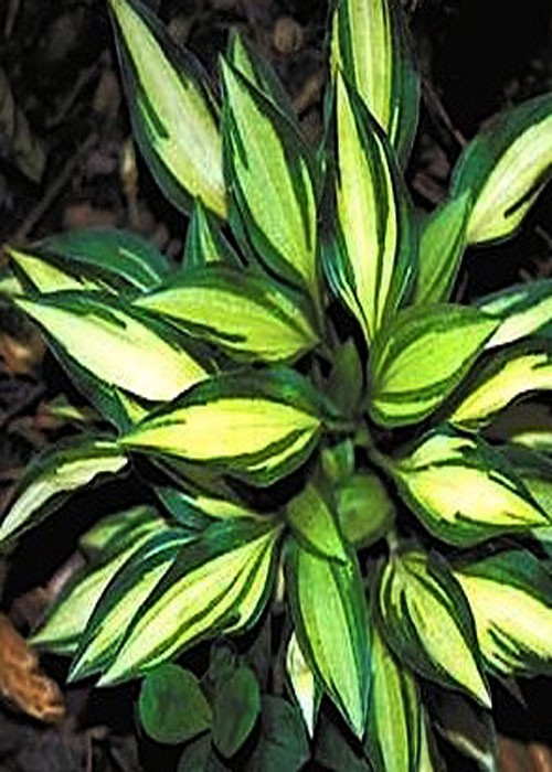 Хоста Teeny Weeny Bikini – Супер міні компактна квітка, карликовий багаторічник, листя маленьке, щільне, стрілоподібне, темно-зелене з кремовими, білими смужками вздовж листа.