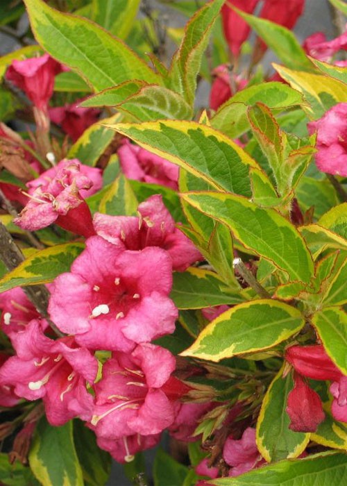 Вейгела квітуча, ремонтантний сорт Брігела виведена у Франції. Декоративно квітучий чагарник із звисаючими гілками. Прямостоячий чагарник висотою 1,52 метра і діаметром 2 метри, листя еліптичні, коротко черешкові зеленого кольору з нерівномірною яскравою, золотистою облямівкою,