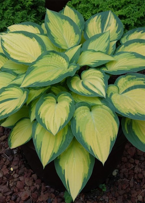 Хоста Orange Marmalade – багаторічна декоративно-листяна рослина з міцним листям кольору слонової кістки та блакитною нерівномірною облямівкою.