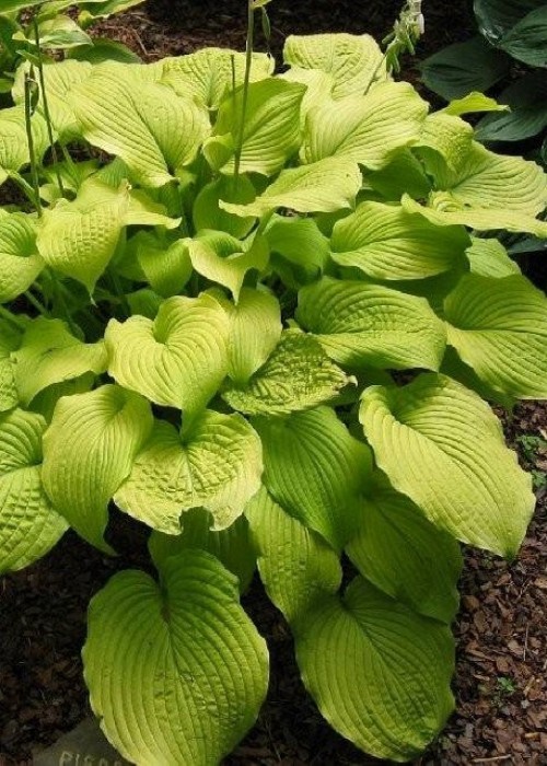 Хоста Piedmond Gold багаторічна декоративно-листяна рослина із золотаво-зеленим листям висота 50 см і шириною 60 см. середній термін цвітіння.